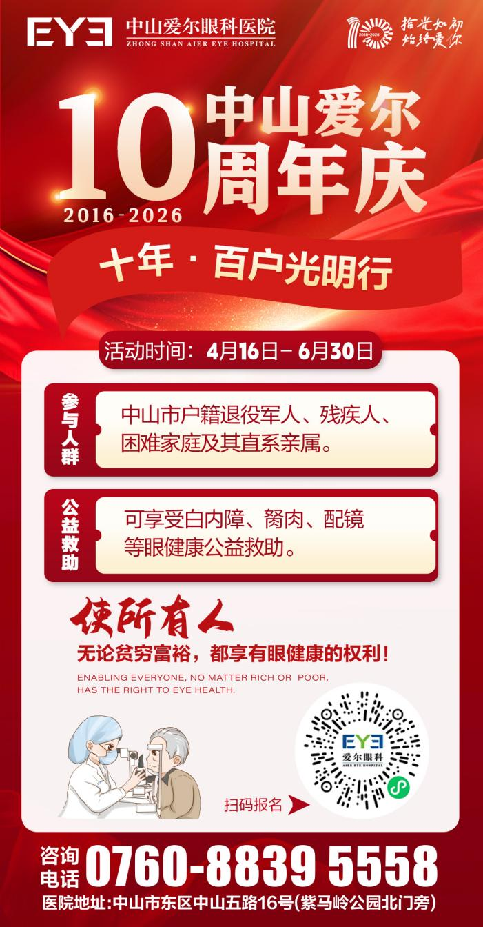 2026年是中山爱尔眼科医院建院十周年,今年2月,医院正式启动“十年·百户光明行”公益行动。该行动以党建为引领,聚焦退役军人、残疾人及困难家庭三大群体,面向全市征集100名符合条件的对象,提供白内障、胬肉手术及低折扣配镜等公益救助。通过专业筛查、定点帮扶、费用减免等方式,精准对接需求,切实减轻困难群体就医负担,让眼健康服务惠及更多人。