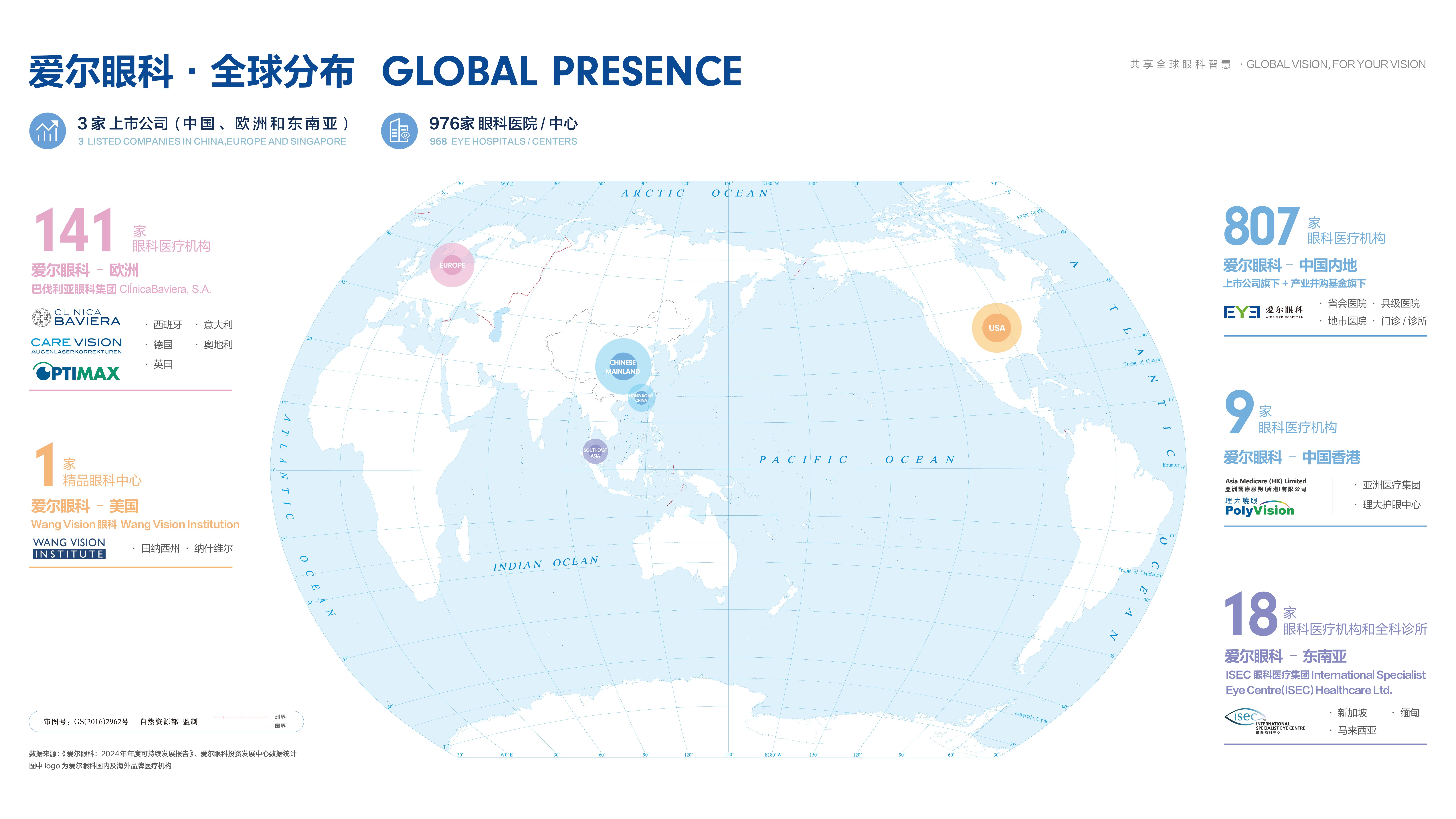 爱尔眼科(股票代码300015)创立于2002年,医疗网络布局亚洲、欧洲和北美洲,于2009年在中国深圳上市(股票代码:300015);公司在欧洲、东南亚的分支机构分别在西班牙马德里(CBAV.MC)、新加坡(SGX:40T)上市。截至2023年12月31日,爱尔眼科品牌医院、眼科中心及诊所在全球范围内共有881家。其中,中国内地750家(包括上市公司旗下439家,产业并购基金旗下311家),中国香港8家,在海外布局突破123家眼科诊所, 包括美国1家,欧洲108家,东南亚14家。